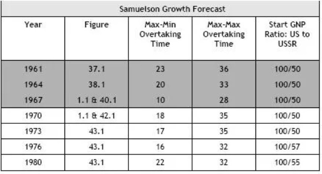 Back in 2006, they published some preliminary findings; now we can see Levy-Peart’s full story. Quick version: Samuelson habitually overestimated Soviet growth, edition after edition. Here’s a nice table summarizing the numbers relayed to millions of students over the decades: