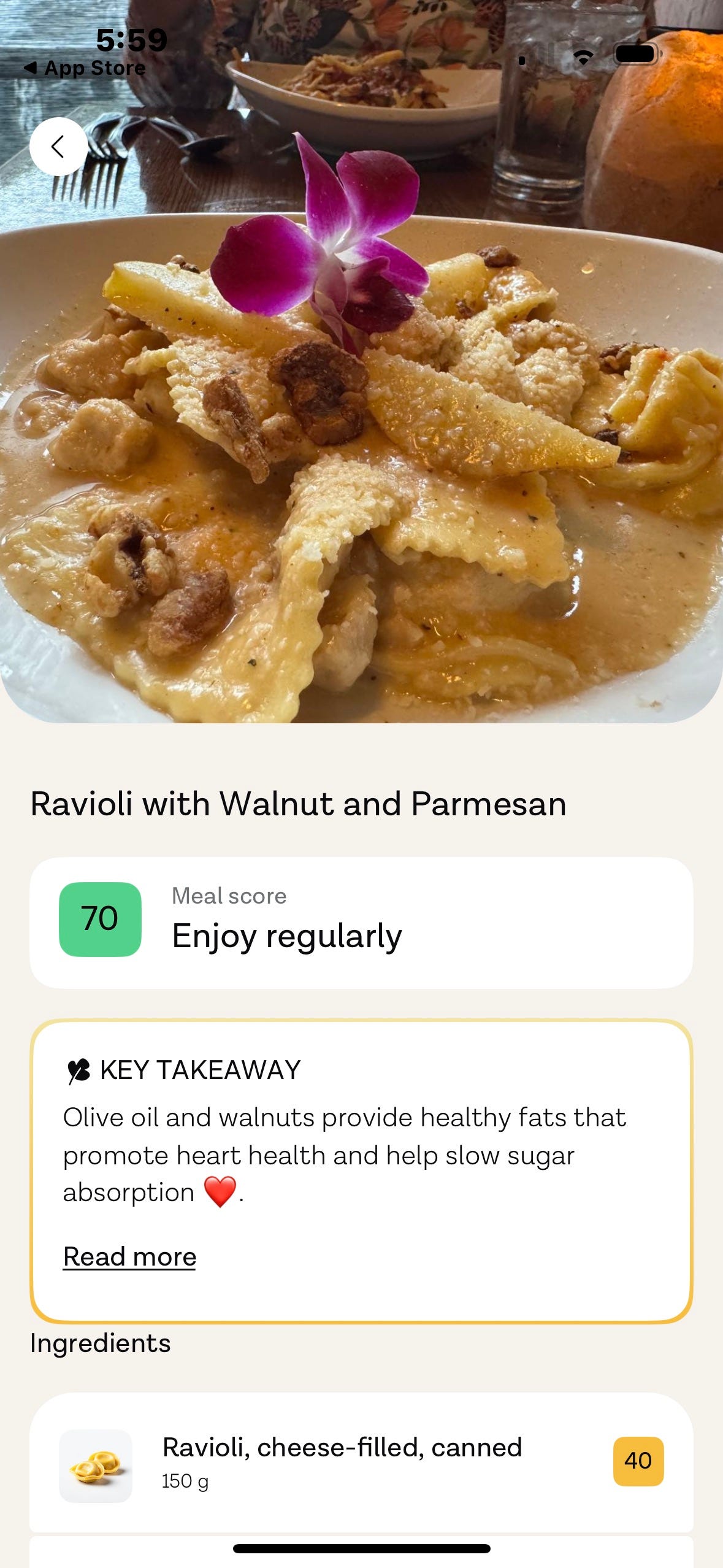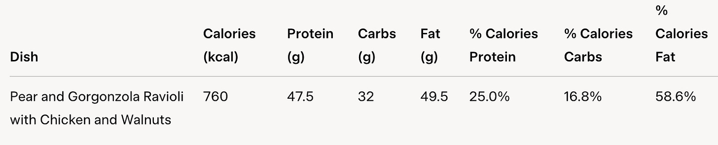 The results are pretty close! Although some nutritionists might complain about the relatively high fat content, both Zoe and Grok agree on the quality of the fats. Since Zoe tends to optimize for blood sugar spikes, it probably treats that fat as a net positive, to counter-act the carbs of the ravioli. Either way, I’m impressed that Zoe was able to come up with a ballpark answer based purely on a photo.