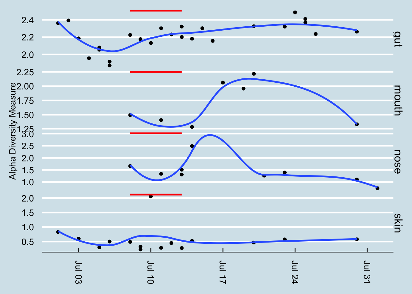 For example, on a trip to China several years ago, the most notable change happened after I returned home: I saw a clear increase in Pseudomonadota (also known as proteobacteria) in my gut, along with a slight uptick in microbiome diversity (Shannon index). Importantly, these changes didn't occur during travel itself, but in the days following my return.