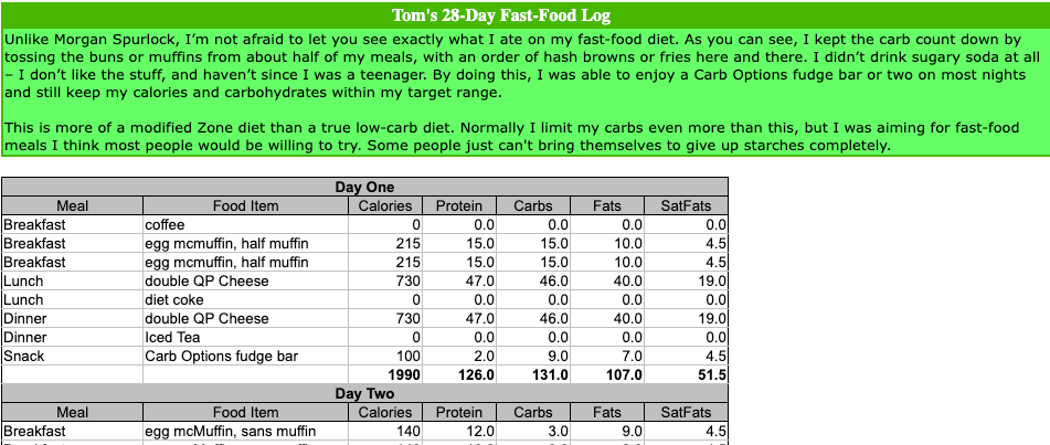 And, Naughton did something Spurlock refused to do: he published his complete food log online. You can verify every meal.