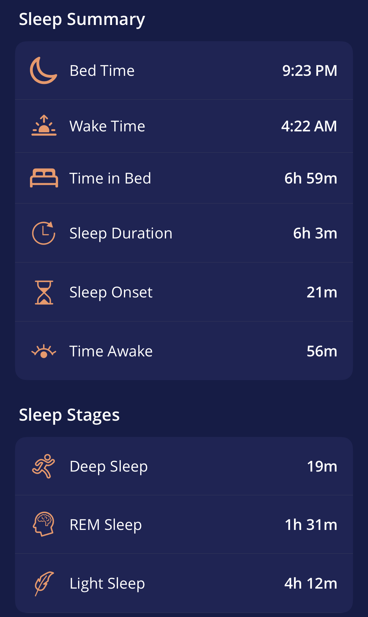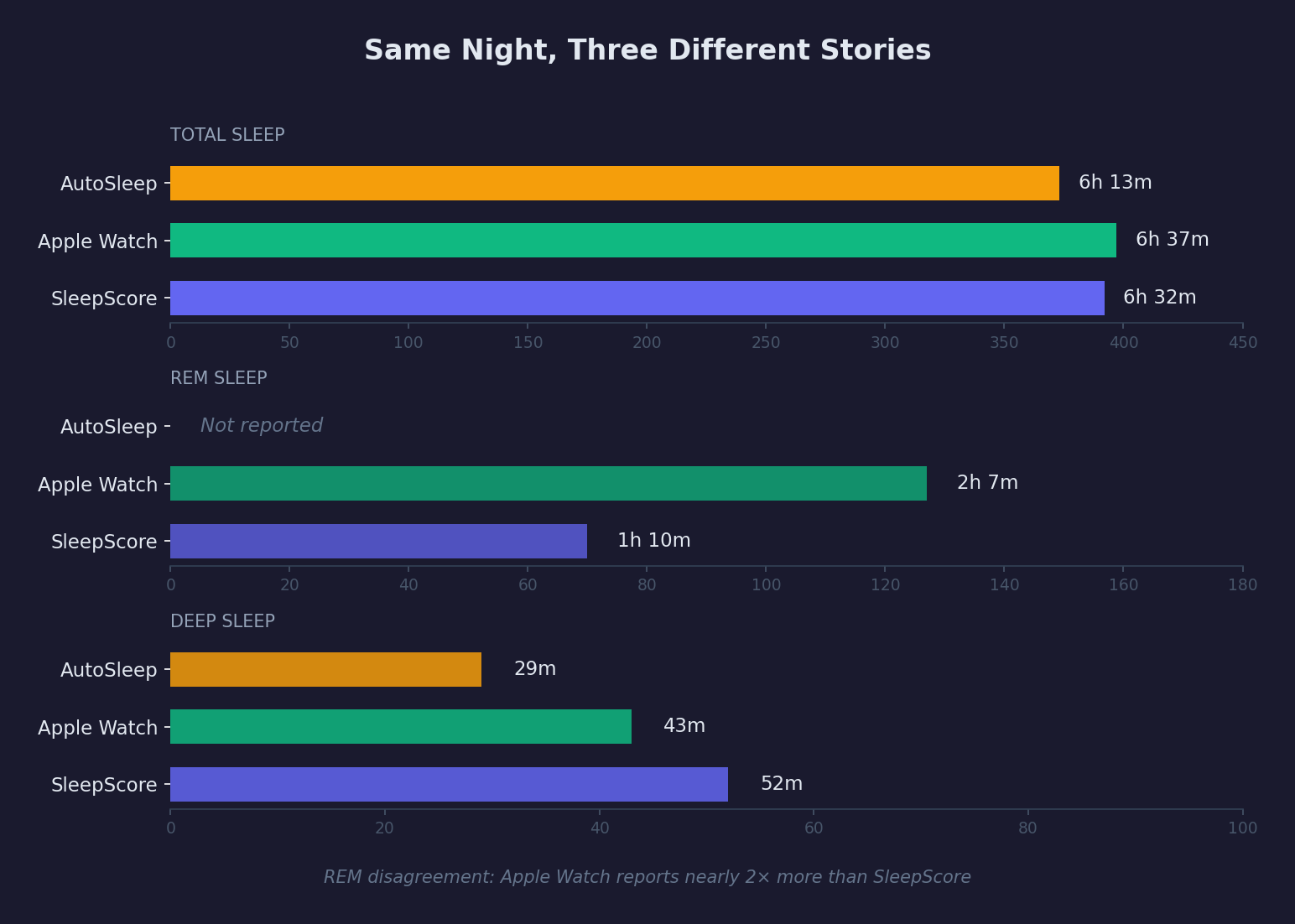 Here’s what years of tracking have taught me: none of them are reliably accurate, and they often don’t match how I actually feel. AutoSleep will report a “great” night when I woke up groggy; Apple Watch will show I was “awake” during periods I don’t remember at all.