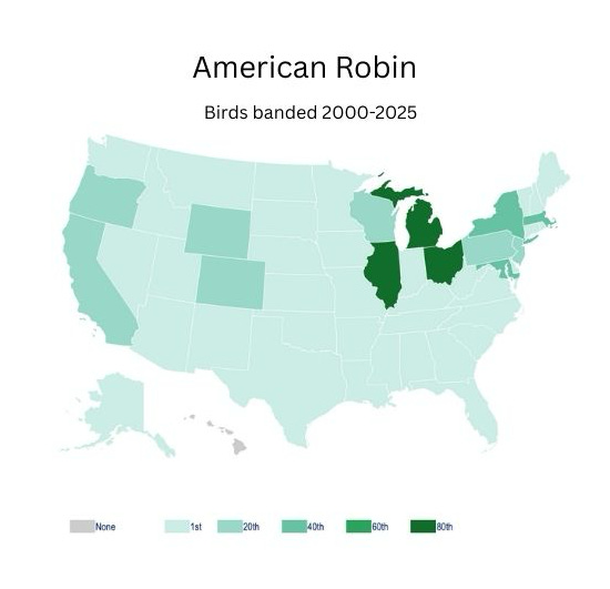 Speaking of other things to track, did you know you need a federal permit to put a band on a wild bird. There’s no fee, but you have to renew every three years. It applies to almost any bird you can think of. But the good news is that this enables a national database showing where all the birds are. Here’s a map of American Robin