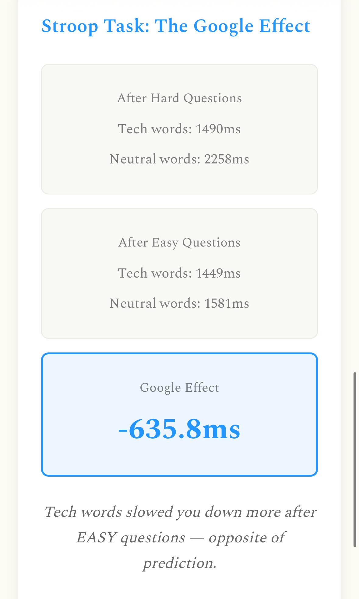 My results were ambiguous. Although in one attempt, the tech words slowed me down more after hard questions—consistent with the Google Effect hypothesis—in other attempts the results were negative.