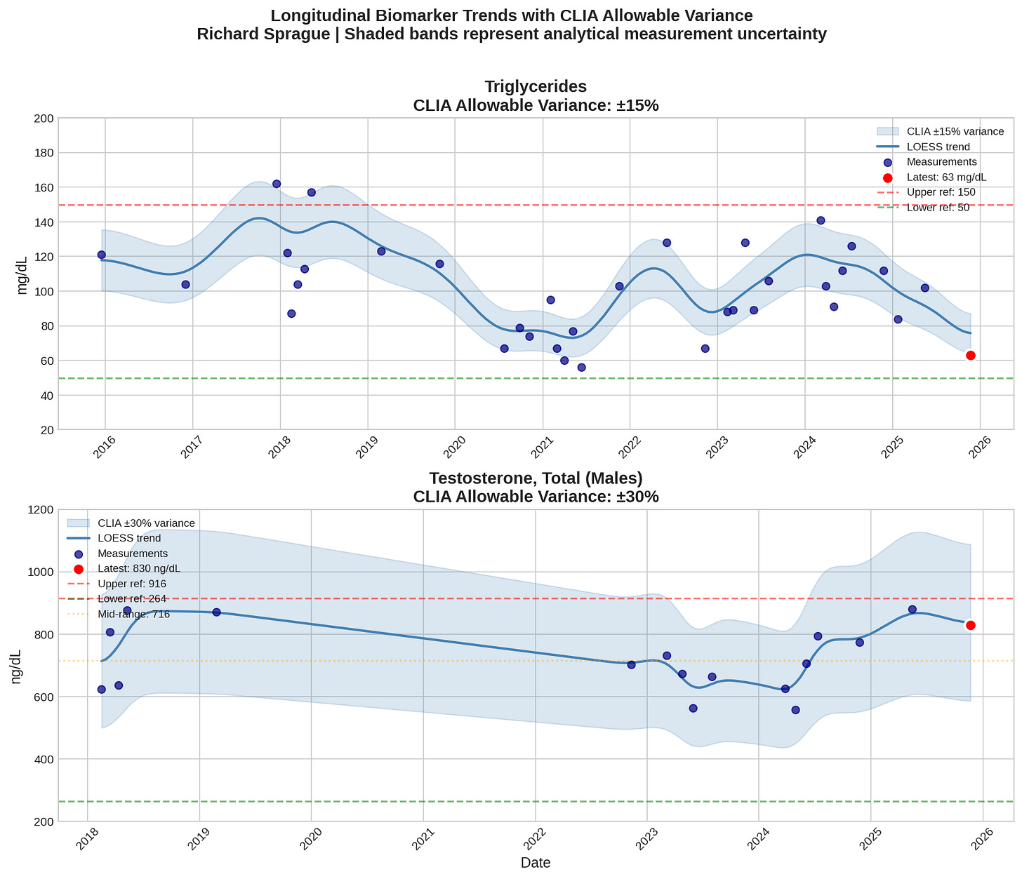 My actual results are somewhere in those shaded bands and in this case, you can tell that I was doing some kind of intervention in the top chart, where the triglycerides go up and down, versus the bottom chart where my overall levels are essentially unchanged.