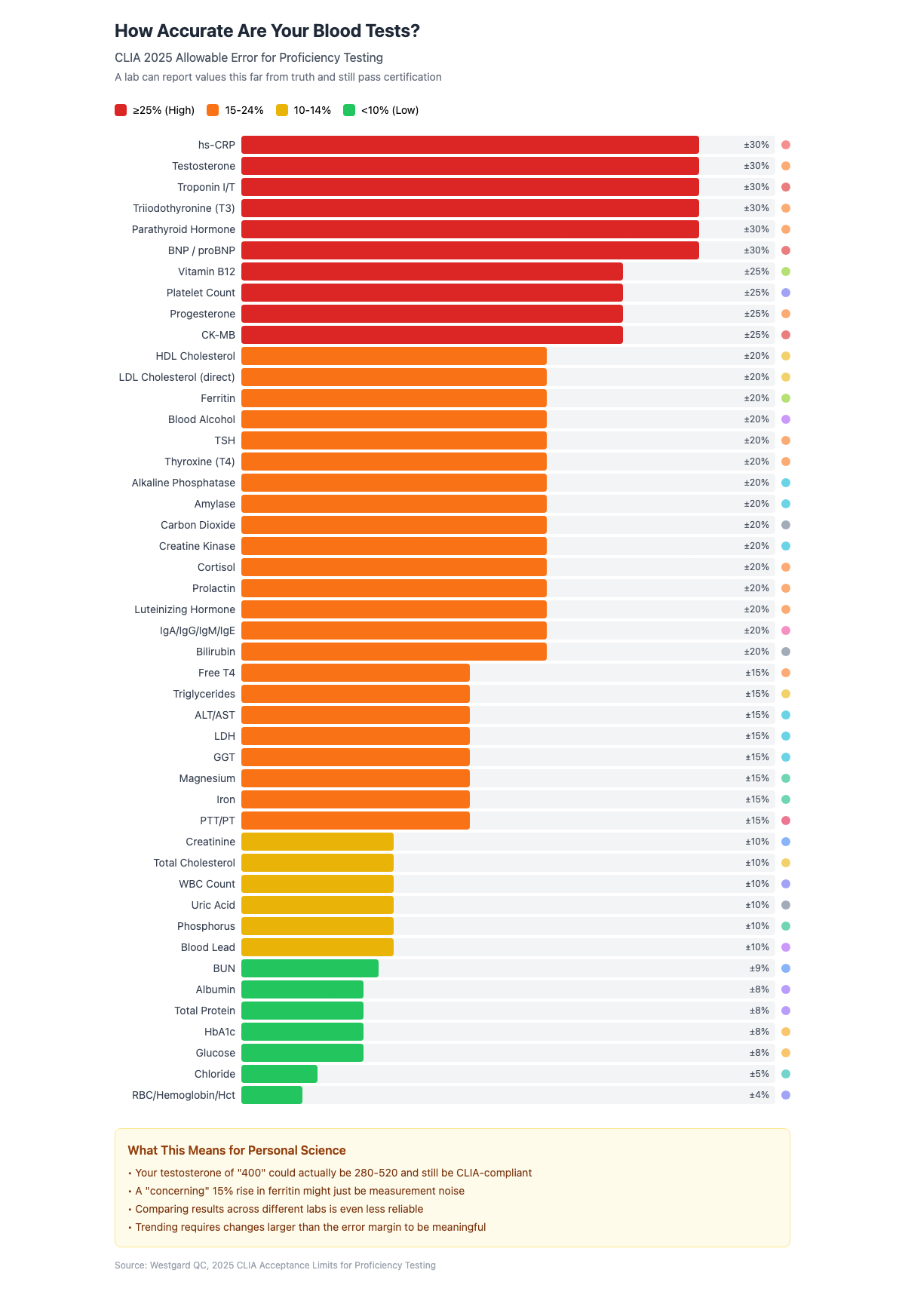 Personal scientists love to track biomarkers over time, watching for changes that might signal a need to adjust diet, supplements, or lifestyle. But here’s something professionals know but rarely acknowledge: the precision we assume in lab results simply isn’t there.