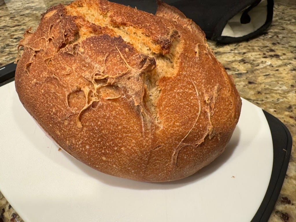 I’ve written about my sourdough bread experiments in PSWeek250911 but here’s the short version: making sourdough from scratch is trivially simple. You literally just mix flour with water and let it sit at room temperature for about a week, “feeding” it daily by discarding half and replacing with fresh flour and water. I’ve continued to experiment several times a week, making sourdough bread whenever I travel and have access to a kitchen.