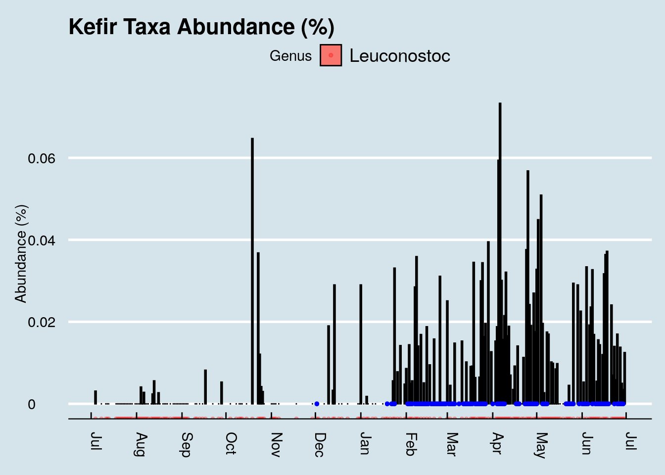 From my microbiome testing: when I drink kefir regularly, Leuconostoc jumps from near-zero to significant levels. Fusicatenibacter appeared only during kefir consumption periods—it wasn’t detectable otherwise.