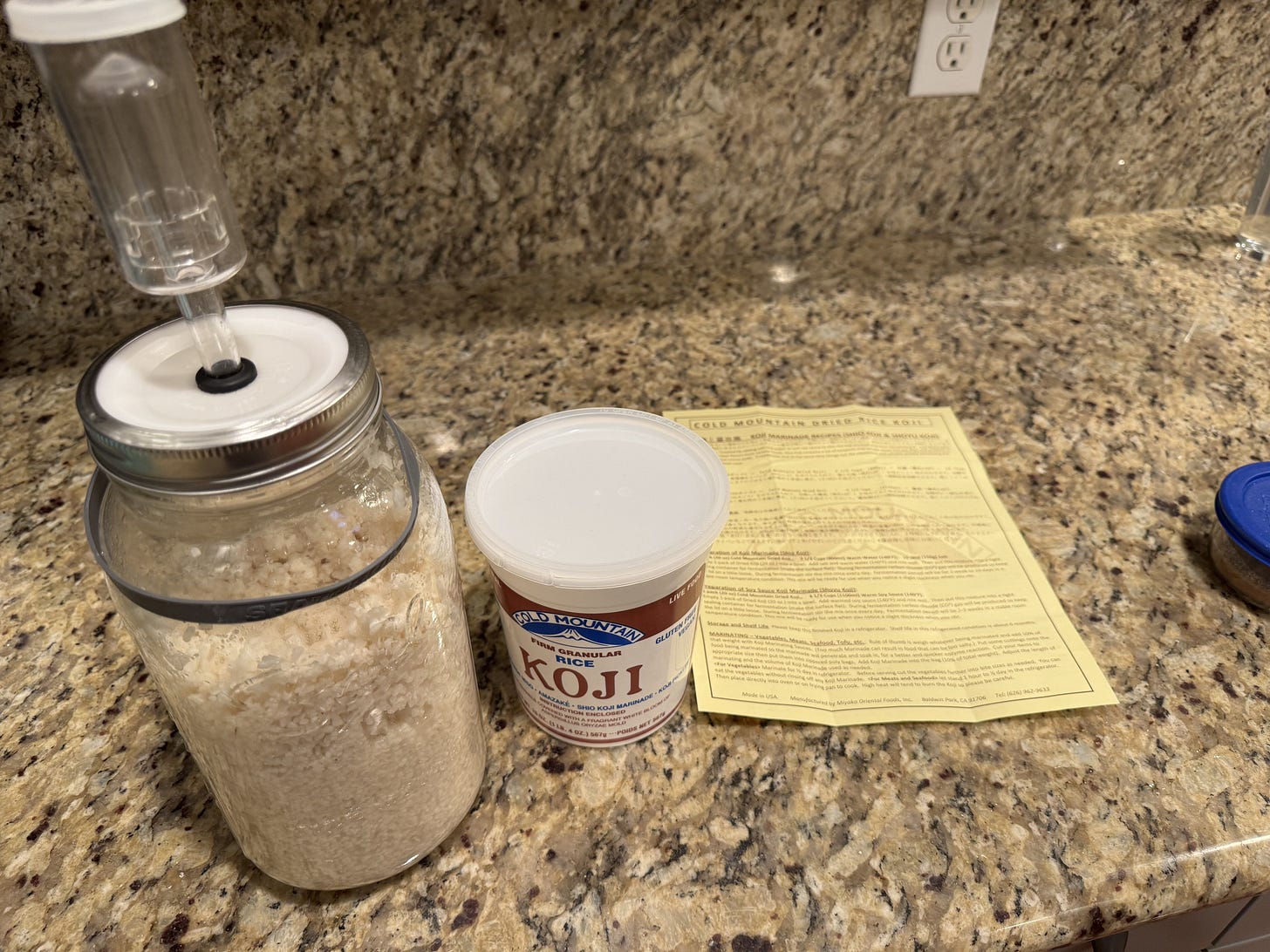 To make the marinade, you need to buy koji grains. I bought a one-pound container of Cold Mountain grains for about $10, but you can buy similar brands through Amazon. It looks like ordinary rice, but you mix it with water and salt (4.5% salinity), stirring daily for a week until it tastes both salty and sweet—that’s how you know it’s ready.