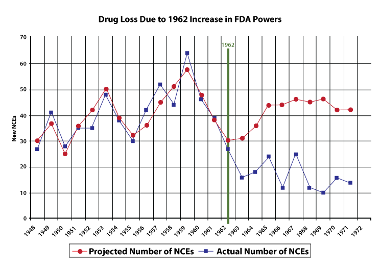 Economist Sam Peltzman studied this rigorously in his landmark 1973 paper. Before 1962, the pharmaceutical industry introduced an average of 40 new chemical entities (NCEs) per year. After the amendments took effect, that number dropped to about 16 per year—a 60% reduction that Peltzman’s statistical model attributes directly to the new regulatory burden. (Paid subscribers know we discussed this in Unpopular Science 240317)
