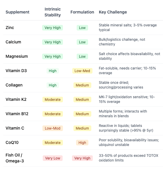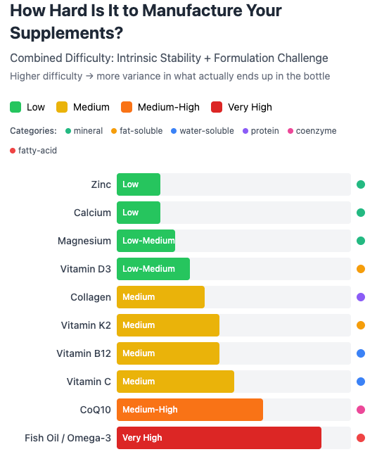 In general, anything that’s a mineral requires little processing (zinc and calcium are basically glorified rock). Something that requires more chemical reactions for processing, or that relies on harvesting biological matter (e.g. fish oil) will be much harder to get right.
