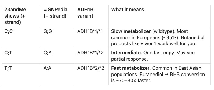 The key SNP is rs1229984 (that link goes directly to your 23andMe raw data browser — you’ll need to be logged in). This encodes the ADH1B Arg48His variant, the single biggest determinant of how fast your liver converts butanediol into BHB.