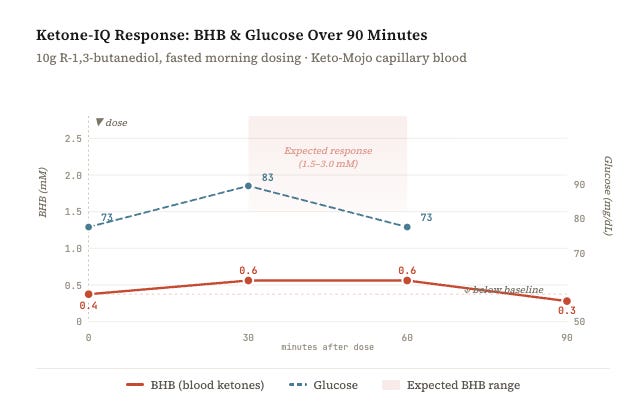 Worse, by T+90 my BHB had dropped below baseline — from 0.4 to 0.3. One plausible explanation: the 70 calories in the shot triggered just enough insulin to suppress my body’s own ketone production, without the butanediol providing adequate replacement. Net effect: I ended up less ketotic than before I drank it.