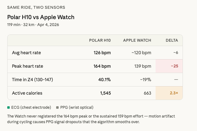 So this week I got a Polar H10 chest strap (~$100) and took it on a two-hour cycling ride alongside my Apple Watch Ultra 2. The results taught me more than I expected.