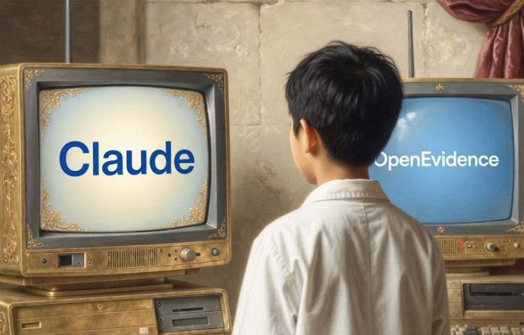 OpenEvidence knows how to answer your question — efficiently, accurately, well-cited. Claude helps more on the what to look for in the first place— something only a human can decide.